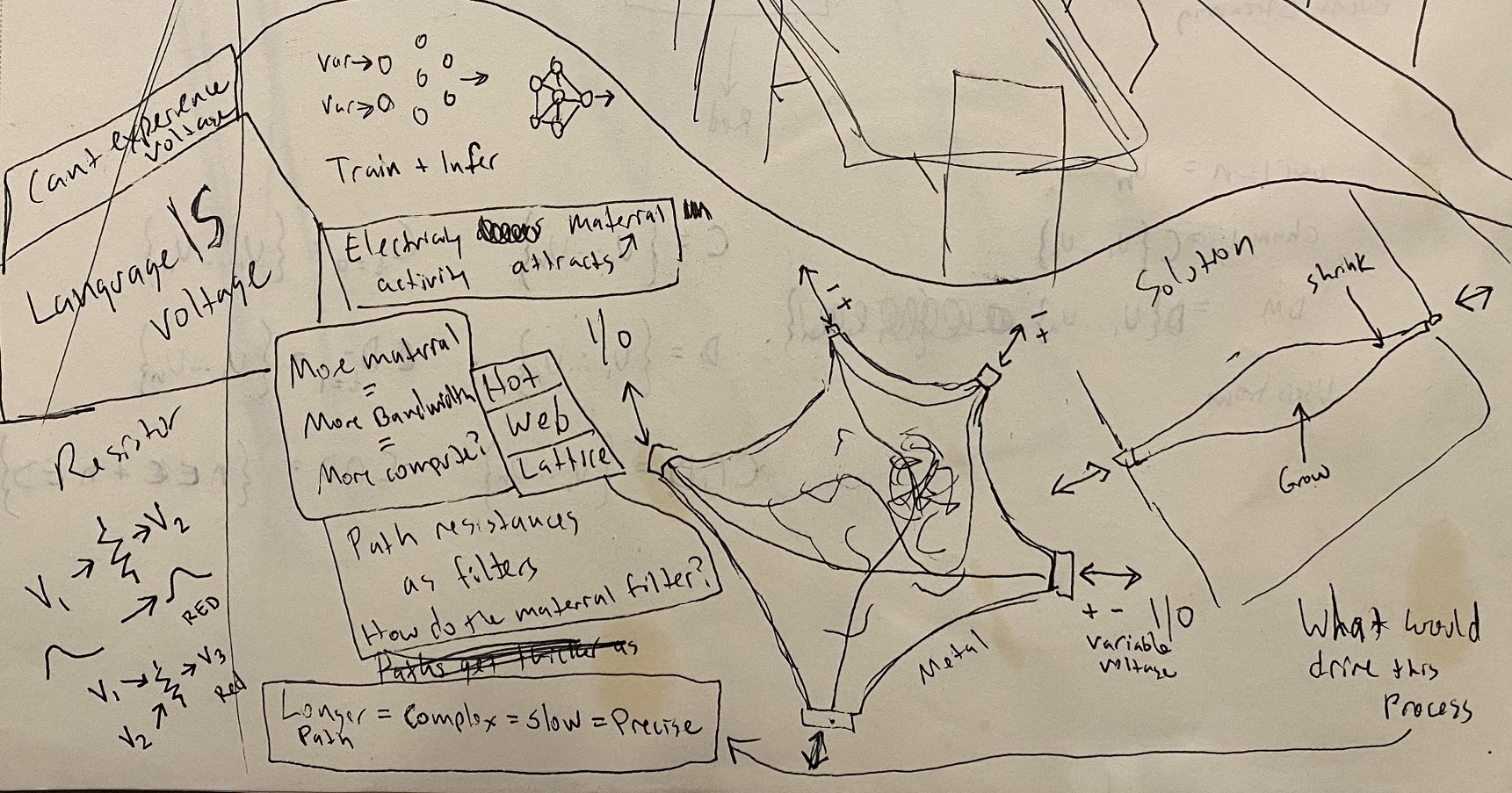 I propose then that a liquid electro-chemical substrate that is materially additive (accretes more permanent power flows) depending on how much power (P = Volts * Amps) is flowing between nodes. That substrate then fills a cube covered in anodes and cathodes that represent individual sensor inputs/outputs.
